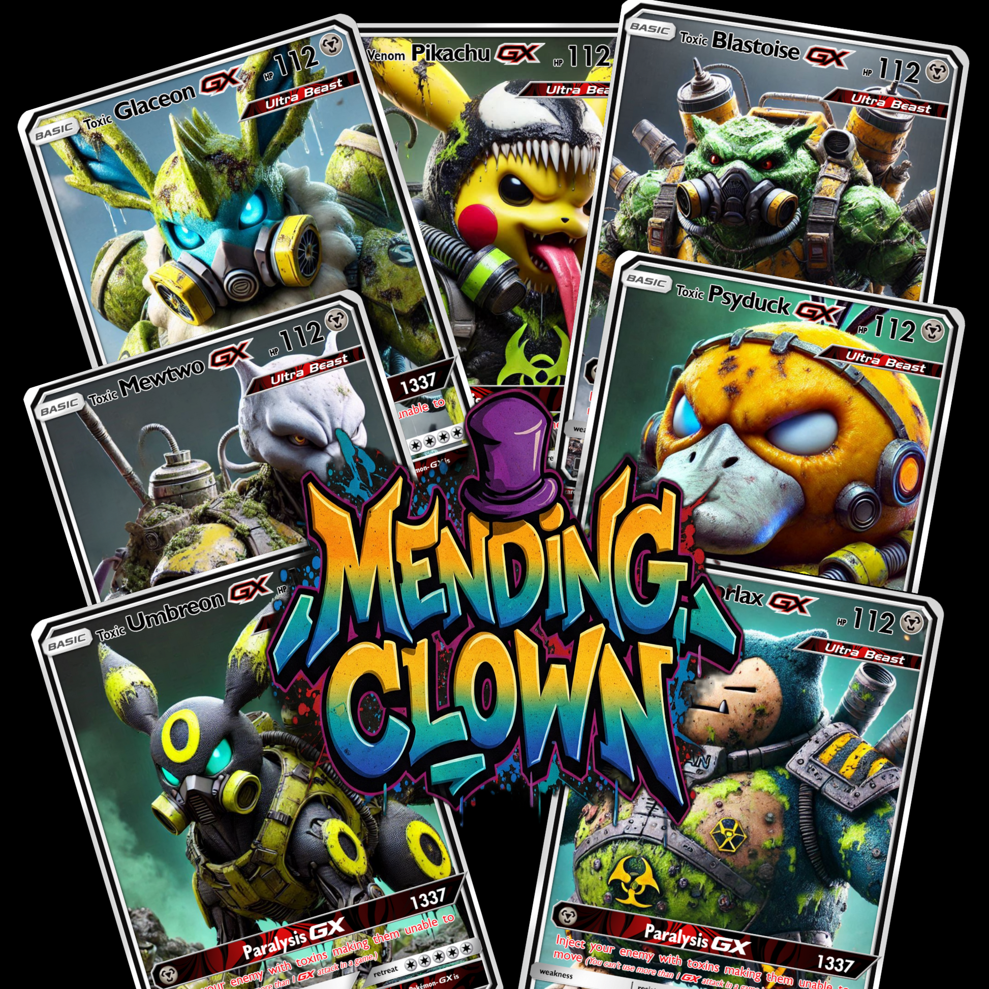 Pack contains 5 Non Tcg Fan art cards with a 30% chance of obtaining a holographic card. Additionally there is a 10% chance to pull a MendingClown Exclusive Graffiti Card.